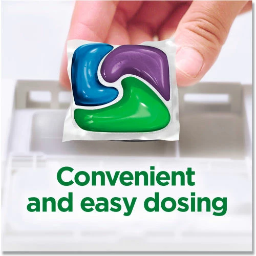 Powder and liquid dishwashing soaps are combined into one convenient pack. Scrub dishes clean while cutting grease. Easy to load without a mess.