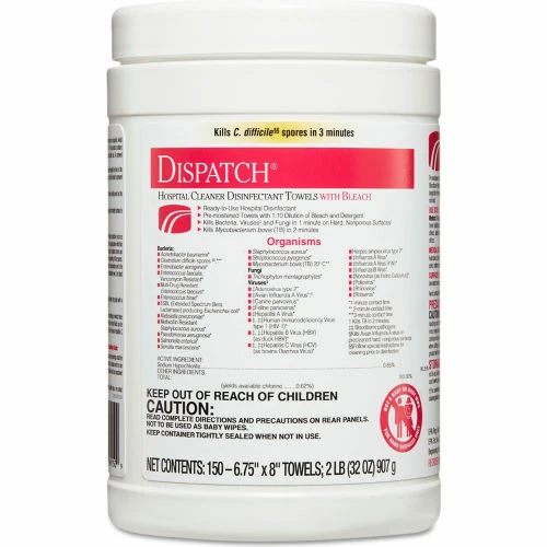 Dispatch® Hospital Cleaner Disinfectant Towels with Bleach are intermediate-level hospital disinfectant wipes that meet CDC CMS and OSHA guidelines for cleaning and disinfecting surfaces in healthcare facilities. They are ready to use, one-step cleaner-disinfectant wipes containing a 1:10 bleach dilution. These premoistened towels are EPA-registered to kill C. Difficile spores in three minutes and other common healthcare pathogens just one minute. These wipes kill 99.9999% of C. difficile spores, according to the current EPA recommended testing standard (June 2014). This is for clinical usage for disinfecting equipment and high-touch surfaces. These wipes feature an anticorrosion agent and are formulated for broad surface compatibility with healthcare surfaces including stainless steel, glass, plastic, porcelain, glazed ceramic, laminated surfaces and vinyl. Features a light fragrance for patient and staff comfort. Intended for use in healthcare settings. Towel/Wipe Type: Disinfecting Wipes; Application: Hospitals; Nursing Homes; Medical Facilities; Applicable Material: Acrylic; Ceramic; Chrome; Fiberglass; Glass; Metal; Plastic; Tile; Vinyl; Wood; Material(s): Non-Woven Fiber.
