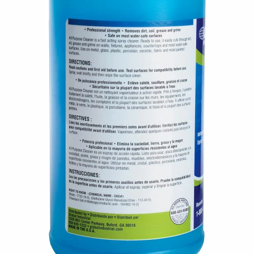 Global Industrial All Purpose Cleaner is a fast acting spray cleaner. Ready to use, it easily cuts through dirt, oil, grease and grime on walls, fixtures, appliances, countertops and most water-safe surfaces. Use on metal, glass, plastic, porcelain, ceramic, fabric and most painted surfaces.