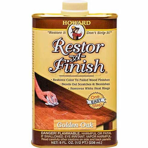 Howard Restor-A-Finish restores the original color and luster in one step, without removing any of the existing finish. With a simple wipe-on, wipe-off process, most finished wood surfaces that seem to need a complete refinishing job can be restored in a few minutes. White heat rings and water marks, scratches, color fade, oxidation, smoke damage and most other blemishes can be quickly eliminated. Golden Oak color finish. 8 oz. Can. 12 Cans/Case.