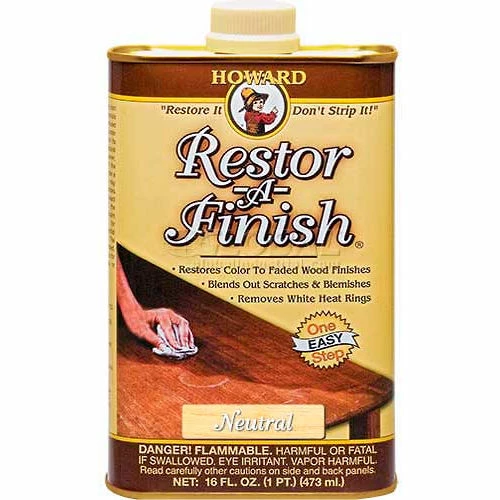 Howard Restor-A-Finish restores the original color and luster in one step, without removing any of the existing finish. With a simple wipe-on, wipe-off process, most finished wood surfaces that seem to need a complete refinishing job can be restored in a few minutes. White heat rings and water marks, scratches, color fade, oxidation, smoke damage and most other blemishes can be quickly eliminated. Neutral color finish. 16 oz. Can. 6 Cans/Case.