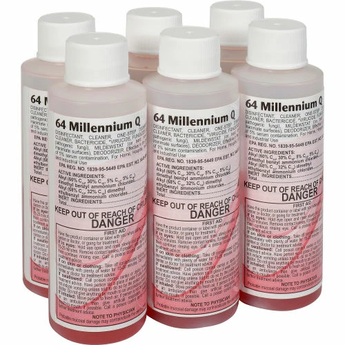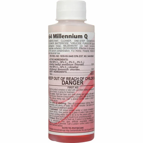 64 Millennium Q delivers non-acid disinfection performance in an economical concentrate. Millennium Q is for use on hard, non-porous surfaces in: Public restrooms, shower and bath areas, hospitals, dental offices, health care facilities, schools and colleges, athletic facilities and locker rooms, correctional facilities, hotels, day care centers and nurseries. Registered on the EPA’s List-N. EPA Reg. # 1839-95-5449