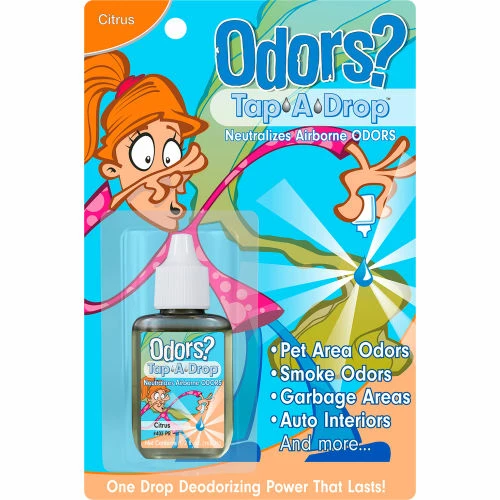 Nilodor Tap-A-Drop Bottle On Rack Card, Citrus Scent, 0.5 oz Bottle, 12/Case