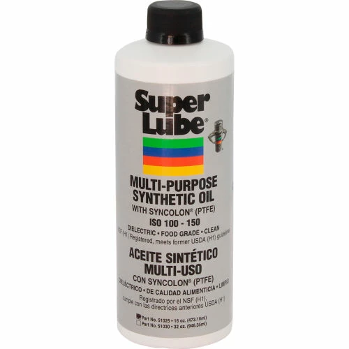 Super Lube® multi-use synthetic oil is premium synthetic oil with suspended Syncolon® (PTFE) particles that is used as a general-purpose lubricant for industrial machinery and equipment. It provides protection against friction, wear, rust and corrosion. Machinery lasts longer, downtime is reduced, and productivity is increased. This oil is safe to use on metal, plastic, wood, leather, painted surfaces and most rubbers. NSF registered food grade lubricant, rated h1 for incidental food contact. Made in the USA. Shelf Life of 5 Years. Case Quantity of 12. Warranty is 24 months from date of purchase.