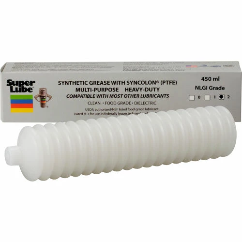 Super Lube® grease is a patented synthetic NLGI grade 2, heavy-duty, multi-purpose lubricant with Syncolon® (PTFE). Synthetic base fluids and the addition of Syncolon® (PTFE) micro powders combine to form a premium lubricant that provides longer life protection against friction, wear, rust and corrosion. Super Lube® multi-purpose synthetic grease is dielectric, food grade, clean and environmentally friendly. It offers good mechanical stability, does not evaporate or form gummy deposits. It will not melt or separate. There is no silicone in Super Lube® multi-purpose grease with Syncolon® (PTFE).it is safe for use in paint spraying and finishing operations. NSF registered food grade lubricant, rated H1 for incidental food contact. Made in the USA. Shelf Life of 5 Years. Case Quantity of 12. Warranty is 24 months from date of purchase.