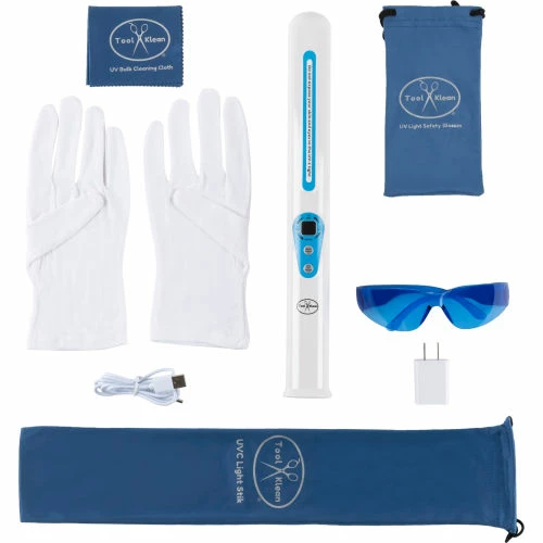 The Tool Klean Anti-Microbial UVC Light Stik Sanitizer is an excellent way to kill germs on items and surfaces such as tables, counters, dog beds/toys, cat litter boxes, bathrooms, computer keyboards, cell phones, masks, groceries and any item or surface exposed to micro-organisms. Using a slow, low sweep of the item or surface does the job efficiently and quickly. The UVC Stik Sanitizer is portable, compact, and great for home, work, or on the go. Tool Klean products are produced in an EPA Establishment facility in New York. Note: EPA regulates all UVC sanitizers as pesticides devices, and they can only be produced by an EPA registered establishment with the proper claims and labeling. MicroChem lab testing results for the Tool Klean Anti-Microbial UVC Light Stik Sanitizer are as follows: S. aureus (bacteria) kill 99.99%, T. interdigitale (ringworm) kill 99.9997%. Features: Digital control 5/15/30 minute timer, Automatically shuts off when turned upward toward eye for safety, Rechargeable battery with an adapter, Kit includes special eye protective glasses w/pouch, skin protective gloves, Stik pouch for travel or storage, and a UVC bulb cleaning cloth, The powerful 4-watt UVC bulb is embedded in reflective material for enhanced treatments, The UVC bulb is wrapped in Shatterproof Safety Film (SSF) to protect against breakage, Bulb life 10,000 hours, Bulb Wavelength 254 nm, Bulb Intensity 1198 uw/cm2.