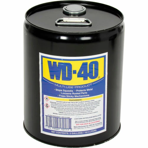 WD-40® Multi-Use Product is a trusted and proven problem solver that works so effectively on so many uses that it can be found in almost every shop and factory in America. Essential in any maintenance environment. WD-40® lubricates moving parts such as hinges, wheels, rollers, chains and gears. Offers excellent corrosion protection by protecting metal against moisture and corrosive elements, and penetrates to free stuck and corroded parts like nuts, bolts, valves and locks. Quickly removes grease, grime, adhesives, paint and much more. Displaces moisture to restore water flooded equipment, tools, engines, and more. 50-State VOC Compliant. 5 gallon pail.